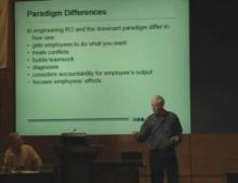 Speaker A Ken actually said to me that he wants to change the paradigm, the dominant paradigm of organizations over the next 15 years. He was afraid after this conference there'd be nothing left for him to do, and he wanted some guidance in how to go about doing that. So I've looked at that question and I said, Change from watt to watt. And that's the first thing we'll look at and move on from there. And the word missing on every page of this is draft, first draft. This is just some initial thoughts about it. The description of both paradigms is not meant to be definitive. It's just a starting and a sketching of some notes. But for me, it starts with the engineering. What are the methods and templates that in the book requisite organization? These are what are suggested that you do actually do within the workplace. And what's the kind of stuff that you pick up when you're looking at the management column in your newspaper or even the Harvard Business Review. So in terms of engineering, the art grounded in a science, the application of the science to the workplace, how do you get people to do things? I think in the dominant paradigm, there's this notion of, well, if you hire people who just absolutely want to do everything, that you won't have to direct them or you build the right culture. I was in a one day workshop at the Schulich School of Business at York University about a month ago, and the whole day was focused on innovation. And the only topic anyone talked about was culture. You need to get an innovative culture. And sort of an hour into said, you know, two words I haven't heard here are strategy and innovation. Sorry. Strategy and accountability and blank looks. People didn't get it that if you hold people accountable and support them to do it, to aggressively pursue your strategy, don't you think people will have to do new things and maybe do things in a new way? And won't that end up with a whole workplace that's doing new things? And won't that end up in an innovative culture, but they start on the opposite direction? So issues of how do you treat conflicts between two people interpersonal? Or is it between roles and lack of clarity? Do you build teamwork by helping people understand and like each other? Or do you coordinate the work they do with each other? Diagnosis how do you get to the root cause of a problem? And the only method that I see over and over again in the dominant management literature is correlation. How do the people who do it well do it? How do the people who don't do it well do it? I think that's part of those of you who haven't seen it get a hold of Elliot's 2002 APA Division 13 paper where he says, this is a model. This is a prescriptive model of how things ought to operate. And like a dot, you know, you don't go to your doctor and say, hey, this is what's troubling me. And your doctor doesn't say, these pills work. For the last few people who had similar symptoms to you, why don't you try it? Your doctor has a theory. So major differences in that, in the engineering. What about the science underneath the engineering? The dominant paradigm, I think, is that people are greedy, and greed, fear, and to some extent, peer pressure is what will get them to do what you want them to do. As versus we all want to work, and we all are motivated, self motivated, to work. And the job of management then is simply to focus and enable. That the notion that if we don't all vote on a goal, that we won't be committed to it, versus, hey, my manager has set this target for me. I've been treated with respect for it. I've been listened to. I don't think it's the right place to go, but I will work with full commitment on it. These are major differences in understanding mean. And this goes back to Harold's comment about what's the science underlying the engineering. So what's the psychology? We have a different understanding of the psychology conceptual framework, going back to Kuhn's notion of a paradigm, the conceptual framework that frames science. And this is the stuff that's not decided by one particular experiment. But how do we go about organizing data? What are the things that we consider possible? When I first met Elliot, I said, do you really believe in these curves? Said, well, what's your problem with it? I said, well, it's not egalitarian. And he said, what's your definition of that term? Well, I get the notion that anyone can do anything that they apply themselves to if they have enough opportunity, said, do you really believe anyone can do what Einstein did or what Mozart did? And in an instant, it kind of reframed my notion. Talked with someone else who comes from a whole other paradigm, and when they respond to that question, they said, well, no, only Einstein could do what Einstein did. Only Mozart could do what Mozart did. And their point was, there is no way, no possible way, you could line one accomplishment as bigger or smaller than another. These things are inherently equal. So the conceptual framework is the stuff that a single fact, a single experience, a single experiment will not change. It takes a whole. And this is the stuff, really, that Ken is talking about changing. So our conceptual framework also says that capability is not distributed continuously. There are useful ways of stratifying it, even the notion, and this comes out in a couple of Elliot's more obscure papers, but you will see people talk about the profit that a product has or the profit that a department generates. And really, when you look at it, requisitely the word profit applies to a strategic business unit to nothing smaller than that. These are major ways of organizing how we think. And they're very resistant to change. Philosophy of science even what do we consider good science to be the dominant model is an empiricist model, by which I don't mean empirical. It's not just that there are data, but if you look at good to great, for example, Jim Collins in the beginning says, hey, 